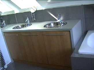 Front in Buche · Deckplatte und Seiten inAbet Riffel · polierte Edelstahlbecken