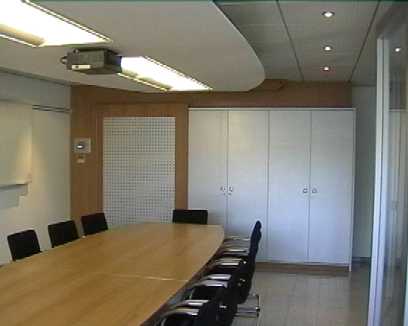 abgehängte Decke mit Videobeamer · am Schrank elektrisch ausfahrbare Leinwand · Besprechungs-tisch für 12 Personen