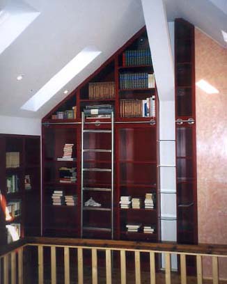 Bordeauxrot lackierte Bibliothek mitverschiebbarer EdelstahlleiterDesign : Jürgen Matt-Stuttgart