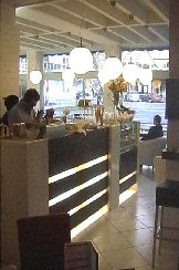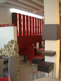 Gastronomie-EinrichtungD´Angeli in Heilbronn - selbstgemachtes Eis von hoher Qualität - Lasagne Bruschetta Pizza Wein und vieles mehr · Nußbaum in Kombination mit Lack Creme · Spiegelwand · Weinregal mit transluzentem rotem Plexiglas