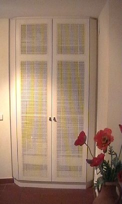 Garderobe mit massiven Rahmentüren und handeingezogenem Korbgeflecht