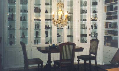 Vitrinenschrank hochglanz lackiert mit Rahmentüren und Facettglasfüllung · umlaufendes Kranzprofil