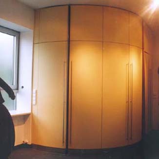 durch den Schrank in das WC · keine gemauerte Wand als Abtrennung zum WC, sondern ein von beiden Seiten zugänglicher Schrank mit Garderobenfunktion · Nextel Vanille Lackierung mit Kirschbaum und Edelstahl