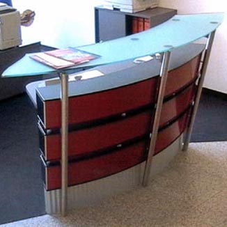 satinierte Glasplatte auf Edelstahlsäulen in UV-Verklebung · darunter ein zweifarbig lackierterkonisch zulaufender Körper · Transparenz und Leichtigkeit waren vom Kunden verlangt und wurden realisiert in den Hausfarben