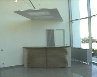 vorne geschwungene Multiplexspanten aufsilberfarbiger Frontplatte · darüber weißlackierte Decke mit Lochblechfüllung undBeleuchtungDesign : Olaf Schürlein