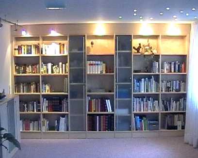 Bücherregal in Birke · satinierte Glastürenmit Edelstahlgriffen · Beleuchtung in derDeckenblendeDesign: Jürgen Matt-Stuttgart