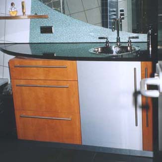 geschwungen Platte in Nero assoluto über einem Unterschrank Birnbaum kombiniert mit Abet Riffel · darüber ein geschwungener Spiegel vor einer Wandvertäfelung in Abet LaminatiDesign O.Schürlein