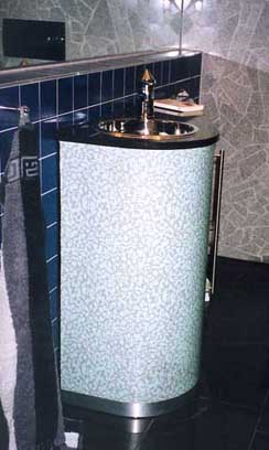 kleines Gäste-WC Möbel tropfenförmig ausgebildet · in Abet Laminati passend zur Wandverkleidung im großen BadDesign O.Schürlein