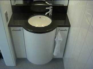 weiß hochglanz lackiert mit Abdeckung inNero assoluto · Porzellanunterbaubecken ·2 kleine Türen und eine große Rundtüre Design O.Schürlein