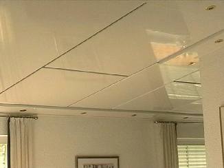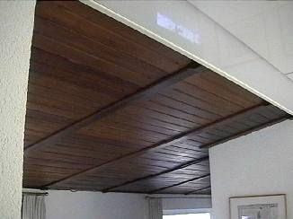 Deckeauf die braune Fichtenholzdecke wurde die weiß hochglanz lackierte Decke mit umlaufendem Beleuchtungsfries montiert< zurück weiter >