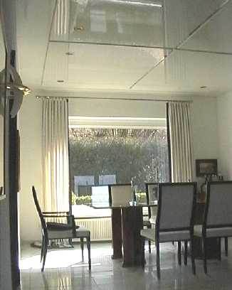 weiß hochglanz lackierte Decke mit Spiegellisenen · Halogeneinbauleuchten in Messing schwenkbar von via-modular.de
