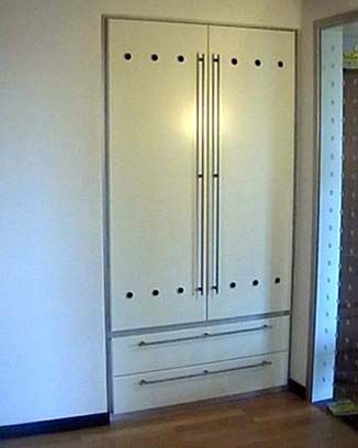 weiß seidenmatt lackiert · 2 überbreite Schubladenfür die Schuhe · Türen mit Belüftungsöffnungen ·Blenden in Aluminium