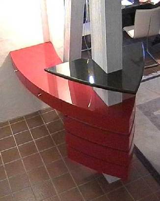 Stehtheke in Form eines Schiffrumpfes ummantelt die Stehtheke die vorhandenen weißen Balkenmit Ablage in Esstischhöhe · 2 Schubladen · darüber Granit Nero assoluto · Lackierung karminrot hochglanz