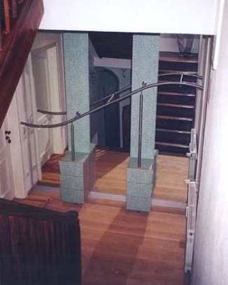 alt und neu in einem Haus aus dem 17. Jahrhundert:Geschwungene Edelstahlstangemit 2 Schubladenelementen in AbetLaminati vor verspiegelter Rückwand