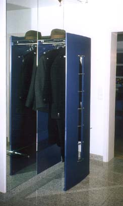 vor verspiegelte Wand gestellte blau lackierte Scheibe, dahinter die Garderobenstange