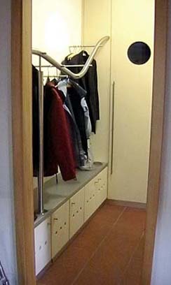 eine geschwungene Garderobenstange nicht nur aus Designgründen: für die Eltern der hohe Bereich, für die Kinder der niedrige Bereich · Lackierung in Nextel, ein extrem widerstandfähiger Lack, der so schnell nicht zerkratzt und bei starken Verschmutzungen mit einer Wurzelbürste und Seifenlösung gereinigt werden kann
