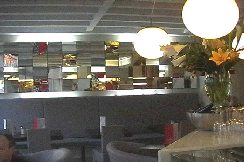 Gastronomie-EinrichtungD´Angeli in Heilbronn - selbstgemachtes Eis von hoher Qualität - Lasagne Bruschetta Pizza Wein und vieles mehr · Nußbaum in Kombination mit Lack Creme · Spiegelwand · Weinregal mit transluzentem rotem Plexiglas