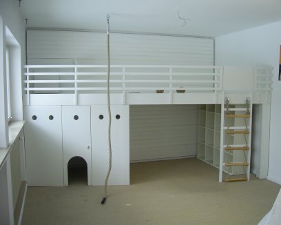 oben das Bett · Strickleiter und Leiter · Höhle mit Durschlupf in der Türe · weiß gestrichen