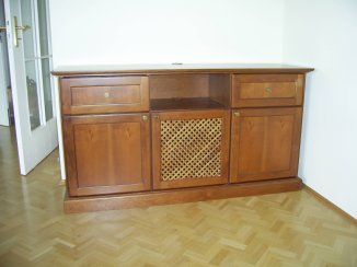 Sideboard für TV und HiFi-Anlage · gestemmte Rahmentüren in Kirschbaum mit Ziergitterfüllung zur Belüftung