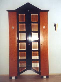 Vitrine in Vogelaugenahorn mit Marmorintasien und schwarz lackierten Sprossentüren
