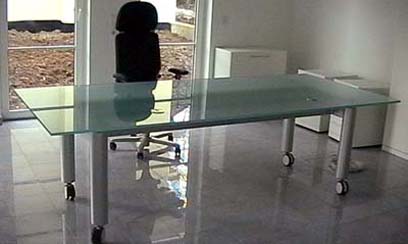viel Platz und ohne Schnörkel ·satinierte Glasplatte 260 x 110 cm auflackiertem Stahlgestell · unter der GlasplatteTraverse mit Kabelzuführung