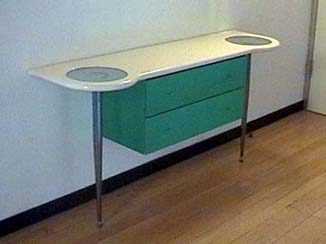 2 Stahlfüße befestigt an mattierten Glasplatten ·die Schubladen in grün eloxiertem Aluminium