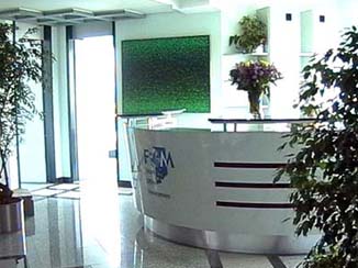 grau hochglanz lackierte Front konisch nachunten zulaufend mit eingearbeiteten Lisenenin den Hausfarben · Sockel Edelstahlstruktur ·oben Abdeckung in Nero Impala