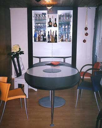 3-teiliger Tisch mit abnehmbaren Platten in Furnier schwarz gebeizt · die Platte werden in der Vitrine dahinter untergebracht · Graniteinsatz