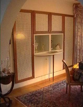 Wohnenaus alt mach neu :massive Rahmentüren in amerikanischem Kirschbaum · cremefarbig lackierte Echtholz-Ziergitter · geschwungene Ablage mit Fuß auf Messingspitze · die alten Korpusse verbergen sich hinter der neuen Front
