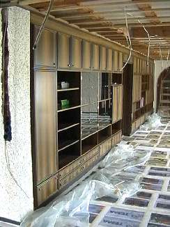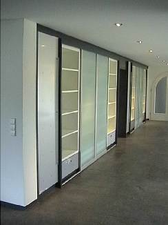 Wohnzimmeraus Alt mach Neu :eine vorhandene Schrankwand in Mooreicheerhält eine neue Fassade : satinierte Glasschiebetüren in Kombination mit Alu-Riffel und Lack weiß/anthrazit